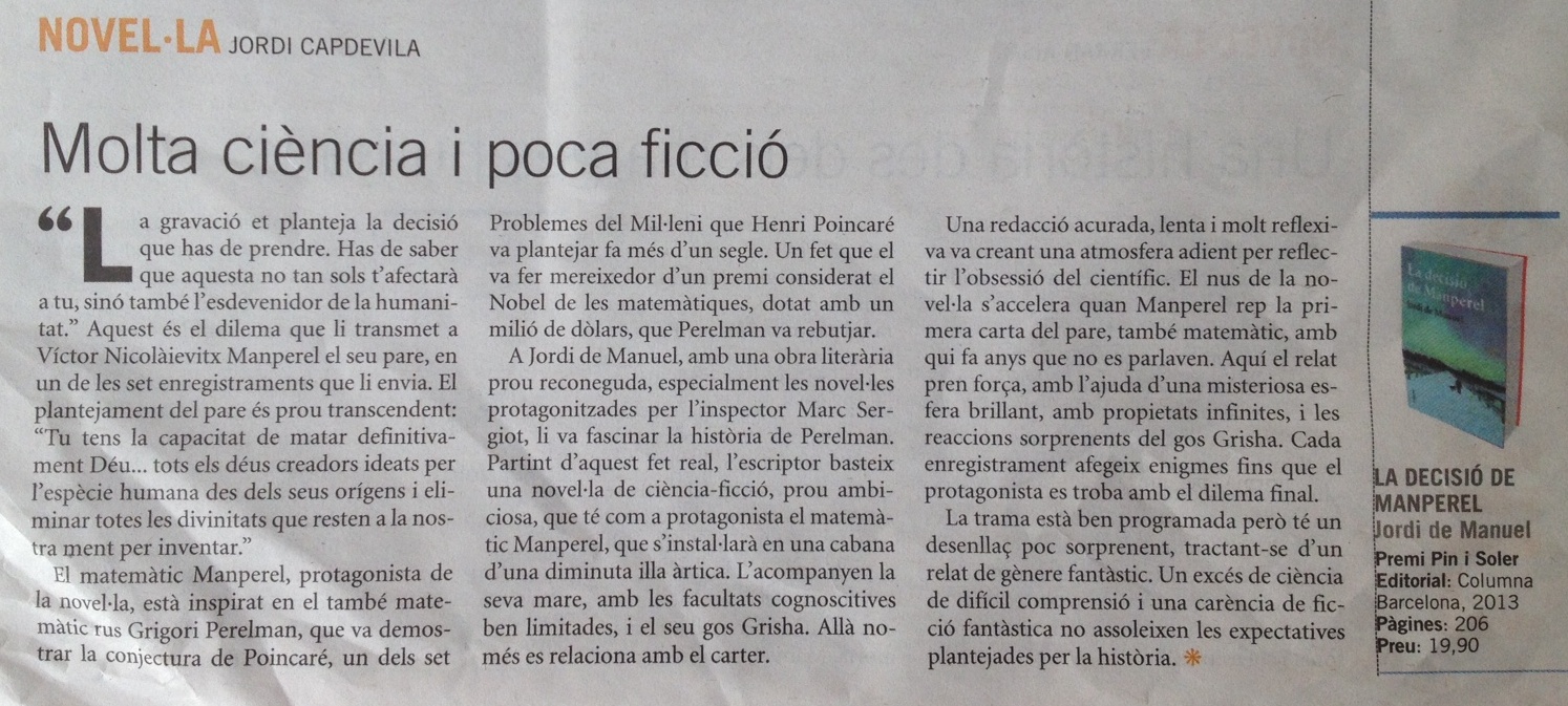 Algunes crítiques i ressenyes publicades: El Fil d'Ariadna, Butlletí de la SCCFF, Núvol, Propera parada Cultura, Quadern de Mots, Nosaltres Llegim, Blog Olga Xirinacs, Time Out, Les Rades Grises, La Vanguardia, Punt/Avui, Salvablog, El Blog de Jordi Cervera, Llegir en cas d'incendi, Serra d'Or, Biblioteca del Kraken, Nervi, Notícies Societat Catalana de Matemàtiques, RecerCat, Viaje alrededor de una mesa, Tumateix Llibres, Rapsòdia, La màgia de les lletres, FantastiK, Chryssula's blog, El Biblionauta, Dreams of Elvex, El Vallenc